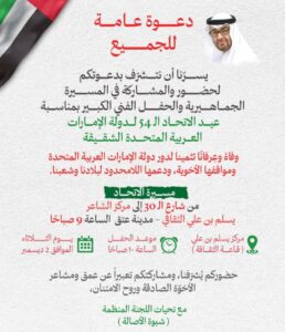أطلقت اللجنة المنظمة “شبوة الأصالة” دعوتها لإقامة احتفال رسمي وفني بمناسبة عيد الاتحاد الـ54 لدولة الإمارات العربية المتحدة في مدينة عتق بمحافظة شبوة تقديرًا لمواقفها الأخوية ودعمها المتواصل لشعبنا.