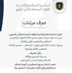 أعلنت الدائرة المالية والإدارية للقوات المسلحة والأمن الجنوبي، اليوم، بدء صرف مرتبات شهر سبتمبر 2025م لفئة الشهداء والجرحى المعاقين، إضافة إلى منتسبي الدفعتين الأولى والثانية.