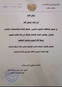وختم البيان الصادر من مكتب الشيخ طلال ، النصر للقوات المسلحة والأمن الجنوبية وعلى عهد الرجال للرجال خلف فخامة الرئيس القائد عيدروس بن قاسم الزبيدي .