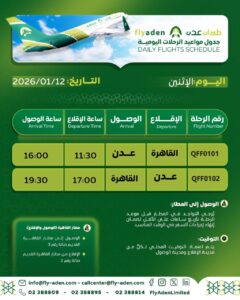 أعلنت طيران عدن عن جدول رحلاتها ليوم الاثنين الموافق 12 يناير 2026م، مؤكدةً استمرار تشغيل رحلاتها اليومية ضمن التزامها بتقديم خدمة نقل جوي موثوقة وآمنة للمسافرين من وإلى العاصمة عدن.