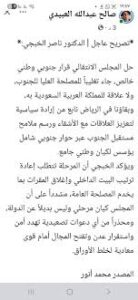 حيث نشر صالح لعبيدي تصريحا للدكتور ناصر الخبجي ويحيى غالب الشعيبي تصريحا وزعه الناشط محمد انور العدني وهو تصريحا كاذبا لا اساس له من الصحة.