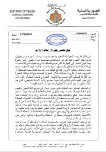 إننا في نقابة أعضاء هيئة التدريس بالجامعات المذكورة نؤكد لكم أن هذا الرهان خاسر ؛ فبعد سقوط الذرائع التي ألفناها سابقاً؛ فالمسؤولية تقع عليكم مباشرة، ولم يعد للذرائع بوجود معوقات سياسية واقتصادية ترمونها على أطراف أخرى أي مبرر أو عذر مقبول، ولذلك فإننا نحمل، الحكومة والتحالف، المسؤولية الكاملة والمباشرة عن هذا التردي الذي يمس جوهر الهوية الوطنية ومستقبل الأجيال؛ فتجارة الأرواح بالولاءات لن تبني وطنا، بل ستدمره، ولن نقبل بعد اليوم بأي تبريرات واهية.