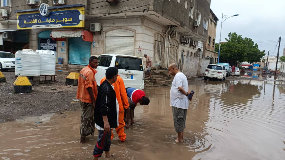 فرق الصرف الصحي بعدن تواصل شفط مياه الامطار في مديريات المنصورة والشيخ ودار سعد