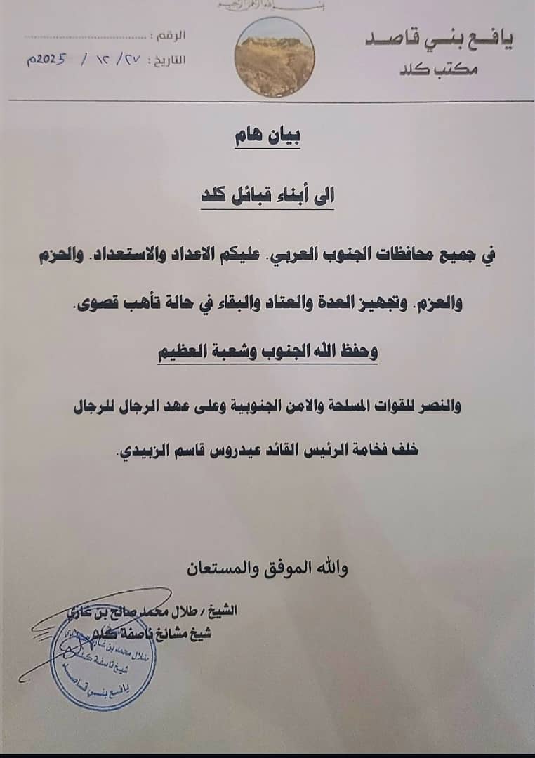 عدن بلس / خاص أصدر مكتب الشيخ طلال محمد صالح بن غازي الكلدي شيخ ناصفة كلد بيان هام جاء فيه