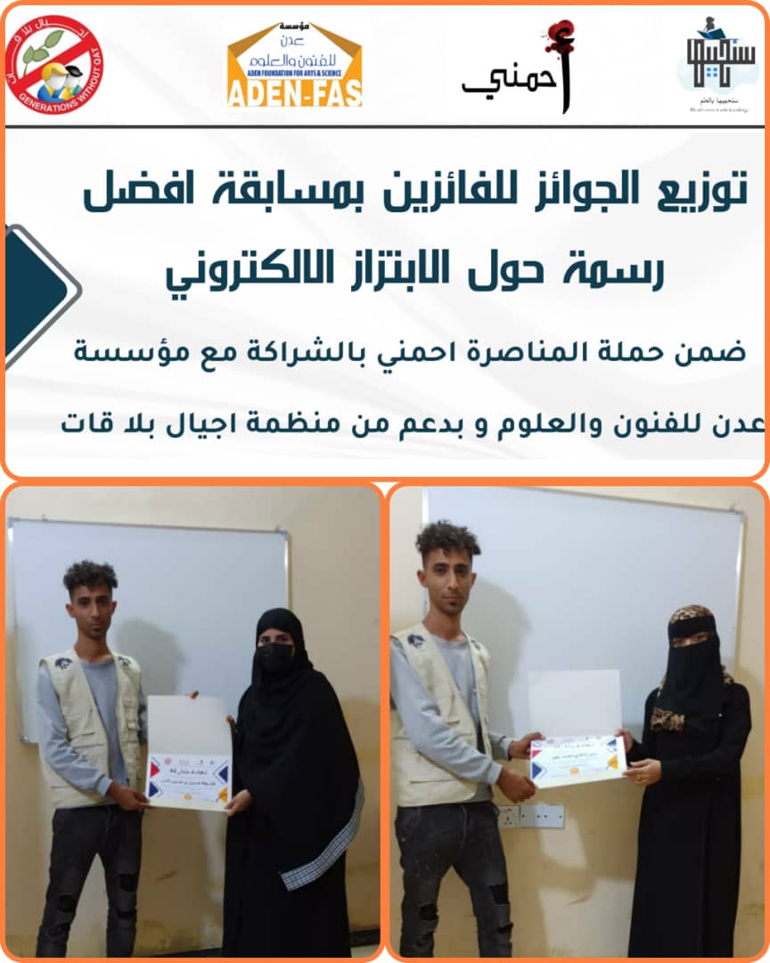 عدن بلس / خاص سلمت مبادرة سنحييها بالعلم الفائزتين بالمسابقة الخاصة بالرسم حول موضوع الابتزاز الاكتروني الجوائز المالية الذي اعلنت