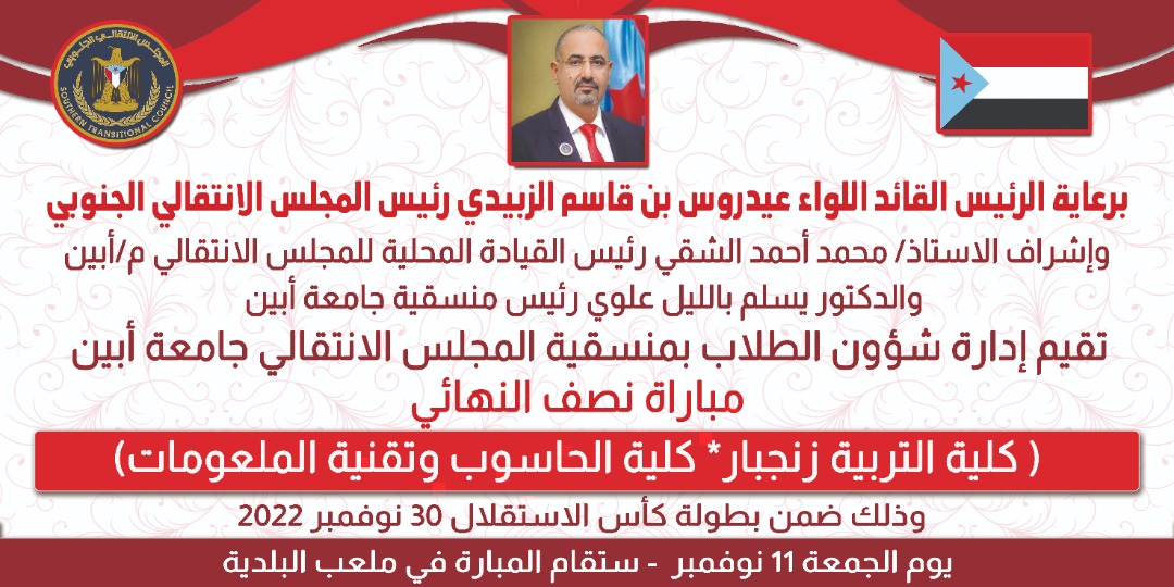 برعاية الرئيس الزبيدي وارئيس انتقالي ابين تقام يوم غد الجمعة ١١ نوفمبر ضمن بطولة كأس الاستقلال على ملعب البلدية بمديرية
