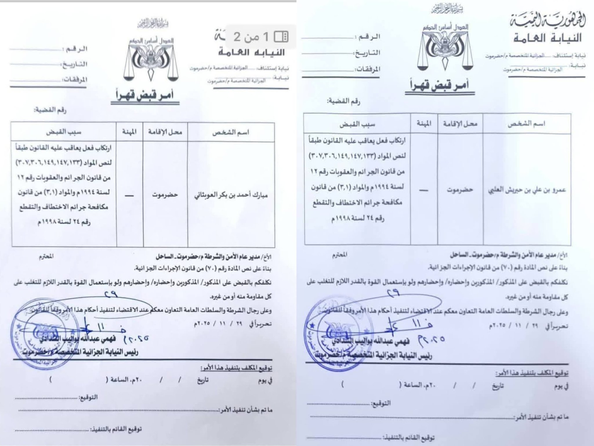 عدن بلس\خاص أفادت مصادر قضائية أن النيابة العامة أصدرت أوامر قبض قهرية بحق كلٍ من عمرو بن حبريش ومبارك